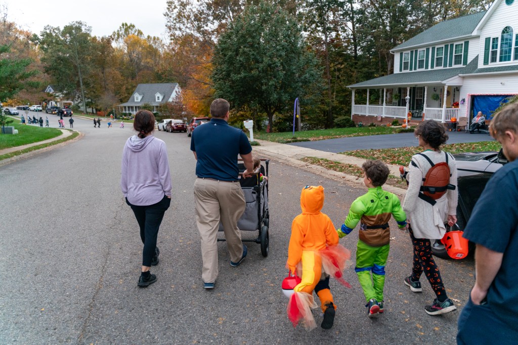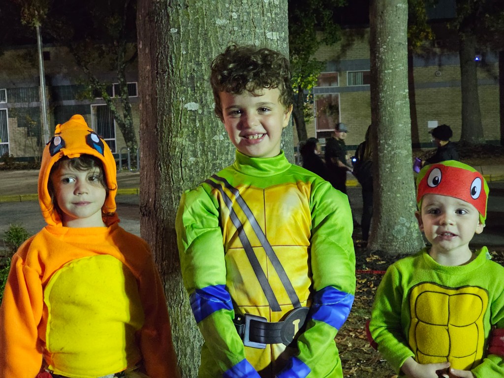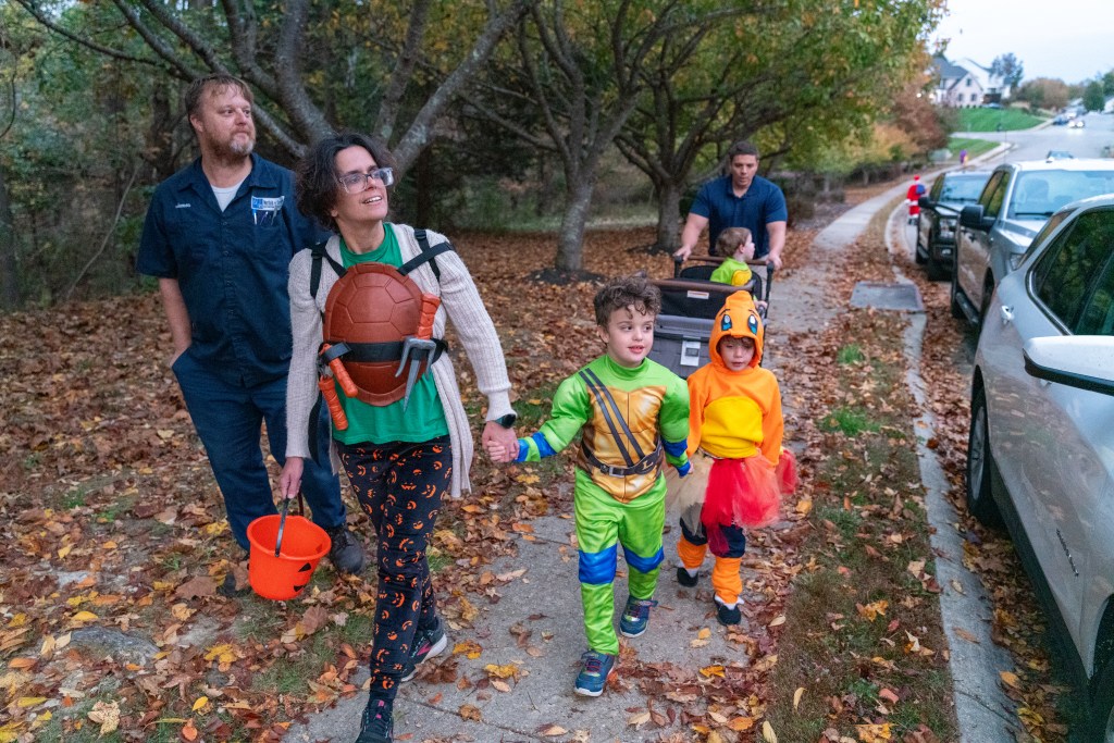 Tuesday, Oct. 31st, three of the cousins returned with their parents for a pizza dinner to trick or treat in the neighborhood. Marianne and James and their son, Michael 7, who was dressed as Leonardo, a Teenage Mutant Ninja turtle, joined Katie and Dan and their two children, Ellie who had a homemade Charmander costume, and Tommy, who was also dressed as Raphael, a Teenage Mutant Ninja Turtle. They were super excited to visit from home to home and collect the Halloween candy. The previous weekend they had gone to at least 7 Trunk or Treat events and already had a lot of candy! When they returned to my house, they spread their candy out on the family room carpet to see what types of candy they had gotten. They were very happy to have gone around the neighborhood together as a family tradition. Uncle Mike accompanies them and is their official photographer.
