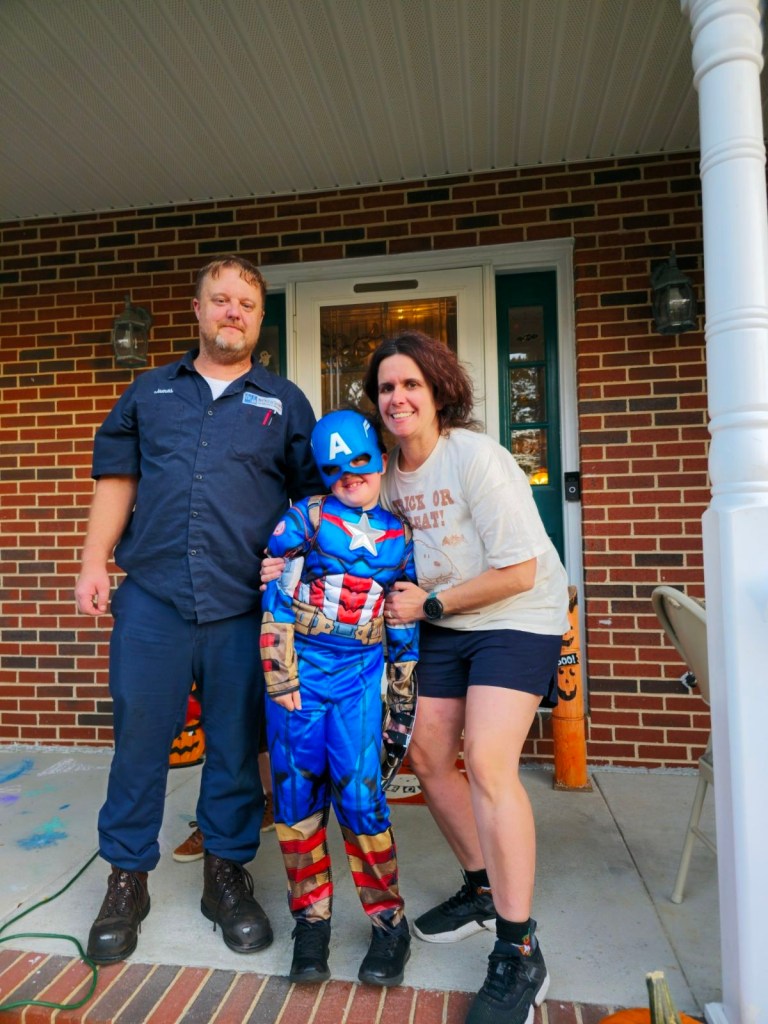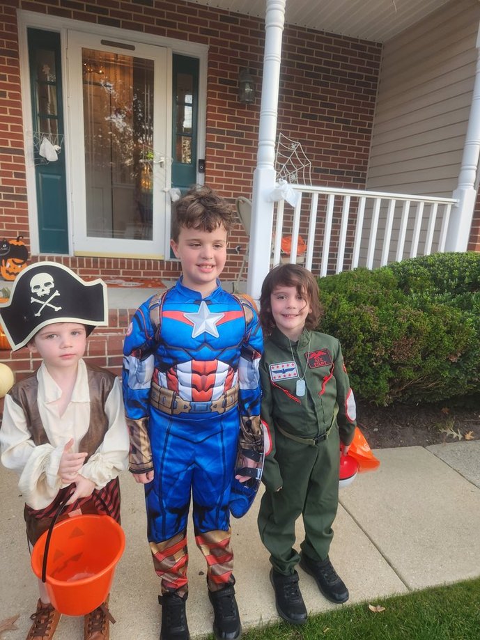 Another exciting Halloween night for my grandchildren. This year Marianne, my daughter and James, her husband, brought Michael my 8 year old grandson over to trick or treat in the neighborhood. My other daughter, Katie and her husband, Dan, brought Eliana, 4 3/4, and Tommy 3 over also. Traditionally, these three cousins come over for a pizza dinner and to trick or treat together in Mom Mom’s neighborhood. They are so excited to trick or treat they gobble up their pizza and are ready to roll out to visit the neighbors. This Halloween was unseasonably hot 80, so despite wanting to be Pluto and Goofy, Eliana and Tommy had a change of costumes. Eliana wore a pilot outfit and Tommy became a pirate. Michael was Captain America.