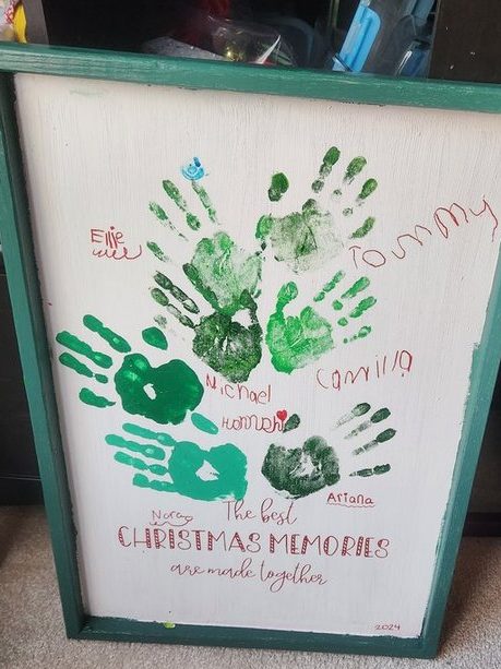 Katie had a great idea for a Christmas decoration for me. She painted a frame, then stenciled it with The Real Christmas Memories are Made Together and had the grandchildren each paint a hand in light or dark green colors and place them on the frame in a shape of a tree signing their names under their hand. This masterpiece will now be a new traditional Christmas decoration at my home. I love it!