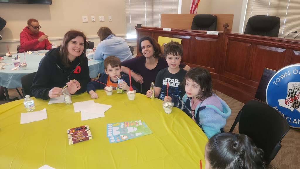 The next morning, I was able to go with Michael, Ellie and Tommy to Town Hall for ice cream with the Easter Bunny. They enjoyed seeing some friends, Cadence and Melody and their Mom, Beth there. They were nice enough to save them a spot at their table. They also were given some crafts to bring home.